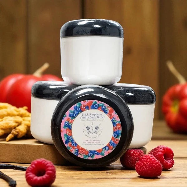 Sweet-tart black raspberry meets creamy vanilla in a velvety whip that melts on contact, wrapping skin in orchard-fresh comfort and cashmere-soft moisture. Inspired by slow Midwest sunsets and bramble-lined fence rows, this indulgent butter opens with juicy black raspberry and ripe berry notes before settling into a cozy vanilla veil that lingers like a warm sweater.