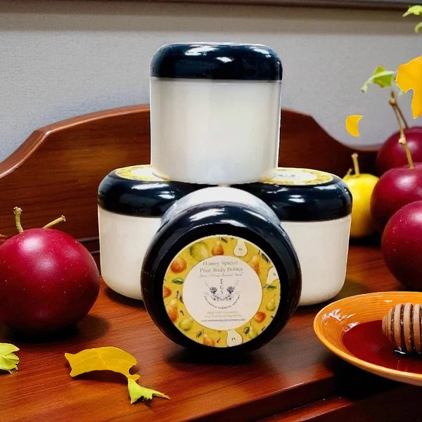 Experience the warm embrace of our Honey Spiced Pear Body Butter, crafted to nourish your skin with every application. This luxurious blend combines the sweet juiciness of ripe Bartlett pear with the rich sweetness of golden honey, enhanced by a delicate dusting of autumn spices that evoke cozy, comforting moments. Bright notes of pear and sugared citrus bring a refreshing lift, harmonizing with tea-like warmth and smooth acacia honey.
